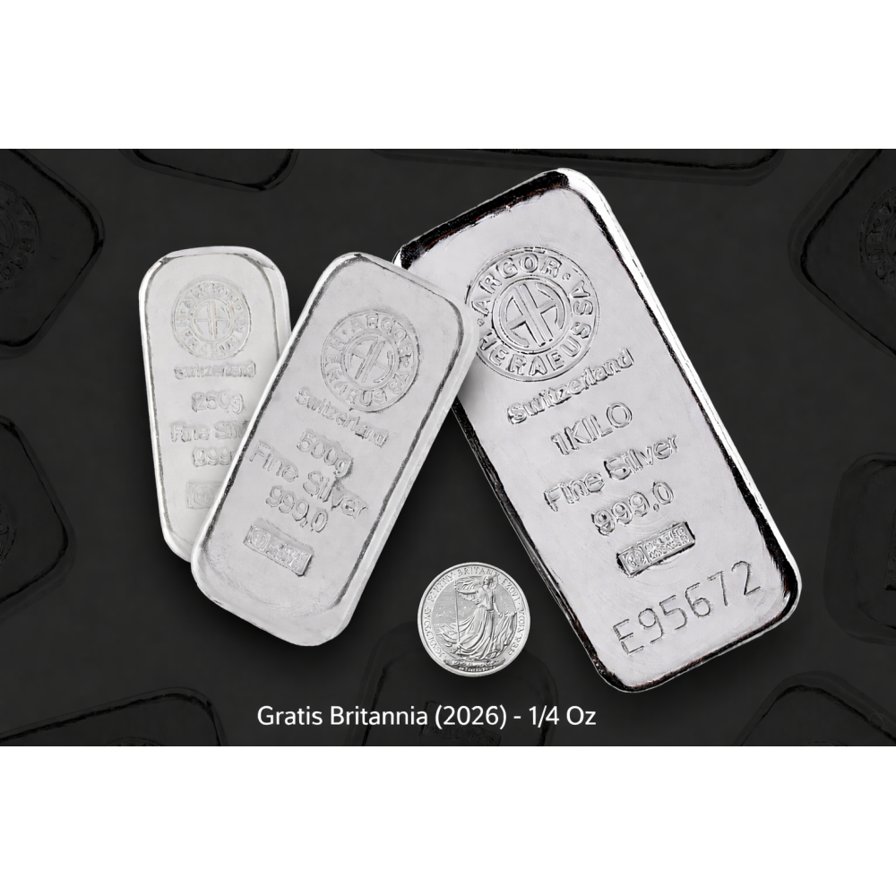 Wenn Sie 1,75 kg Silber kaufen, erhalten Sie eine 1/4 oz Britannia-Münze gratis dazu.
