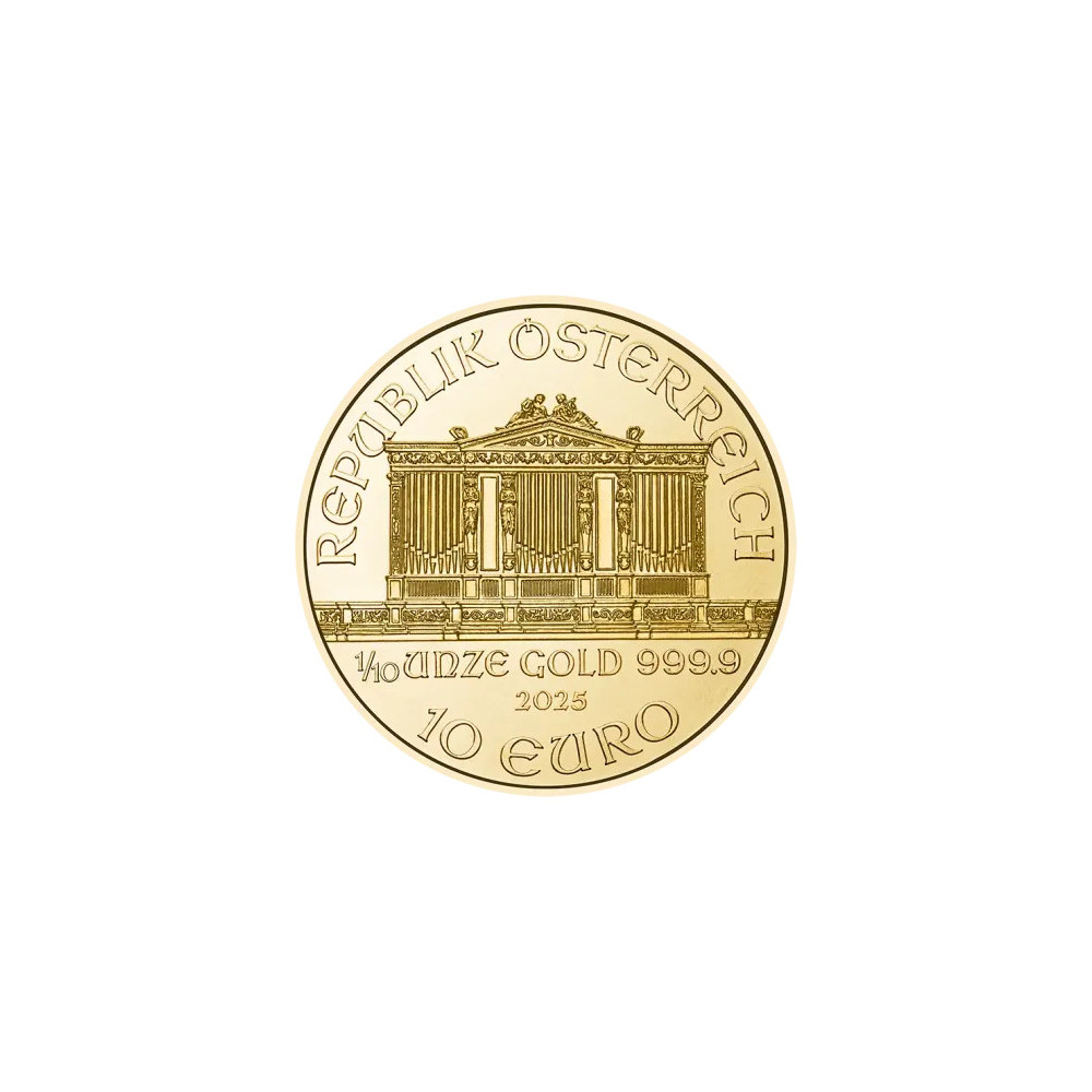 Die Wiener Philharmoniker verdanken ihren Namen dem berühmten österreichischen Orchester, das zu den besten der Welt zählt. Auf der Vorderseite der Goldmünze ist die große Orgel des Wiener Musikvereins abgebildet. Unterhalb der Orgel sind das Gewicht von 1/10 Unze, der Feingehalt von 999,9, das Prägejahr und der Nennwert von 10 EURO eingeprägt. Darüber ist die Inschrift "REPUPLIK ÖSTERREICH" eingeprägt. Auf der Rückseite sind einige Musikinstrumente des Philharmonischen Orchesters abgebildet und am oberen Rand ist der Name des Orchesters und die Goldmünze "WIENER PHILHAMRONIKER" zu sehen. Wie die oben genannten Goldmünzen ist auch die Wiener Philharmoniker in den Größen 1 oz, 1/2 oz, 1/4 oz und 1/25 oz erhältlich.