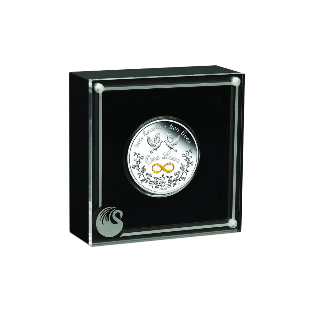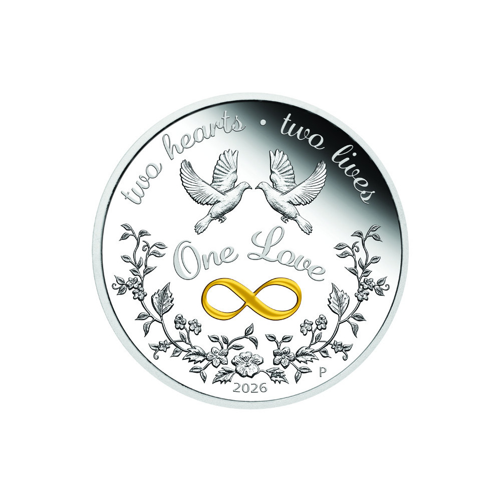 Auf der Rückseite der Münze befinden sich zwei Tauben und ein buntes Unendlichkeitssymbol sowie die Aufschriften "ONE LOVE", "TWO HEARTS", "TWO LIVES" und das Prägejahr - 2026.