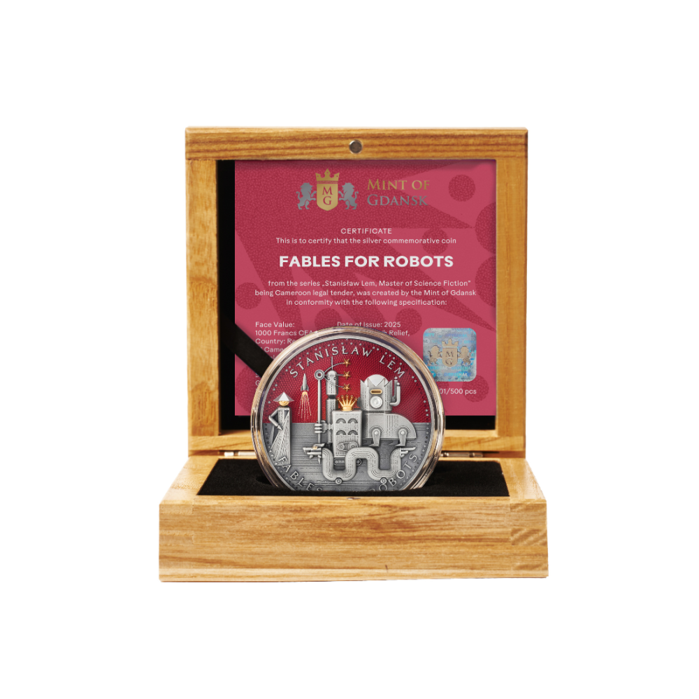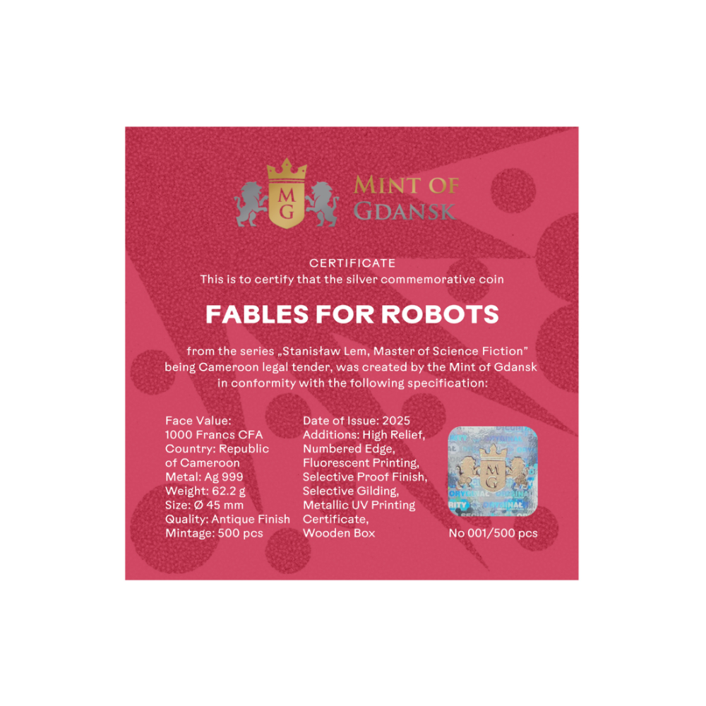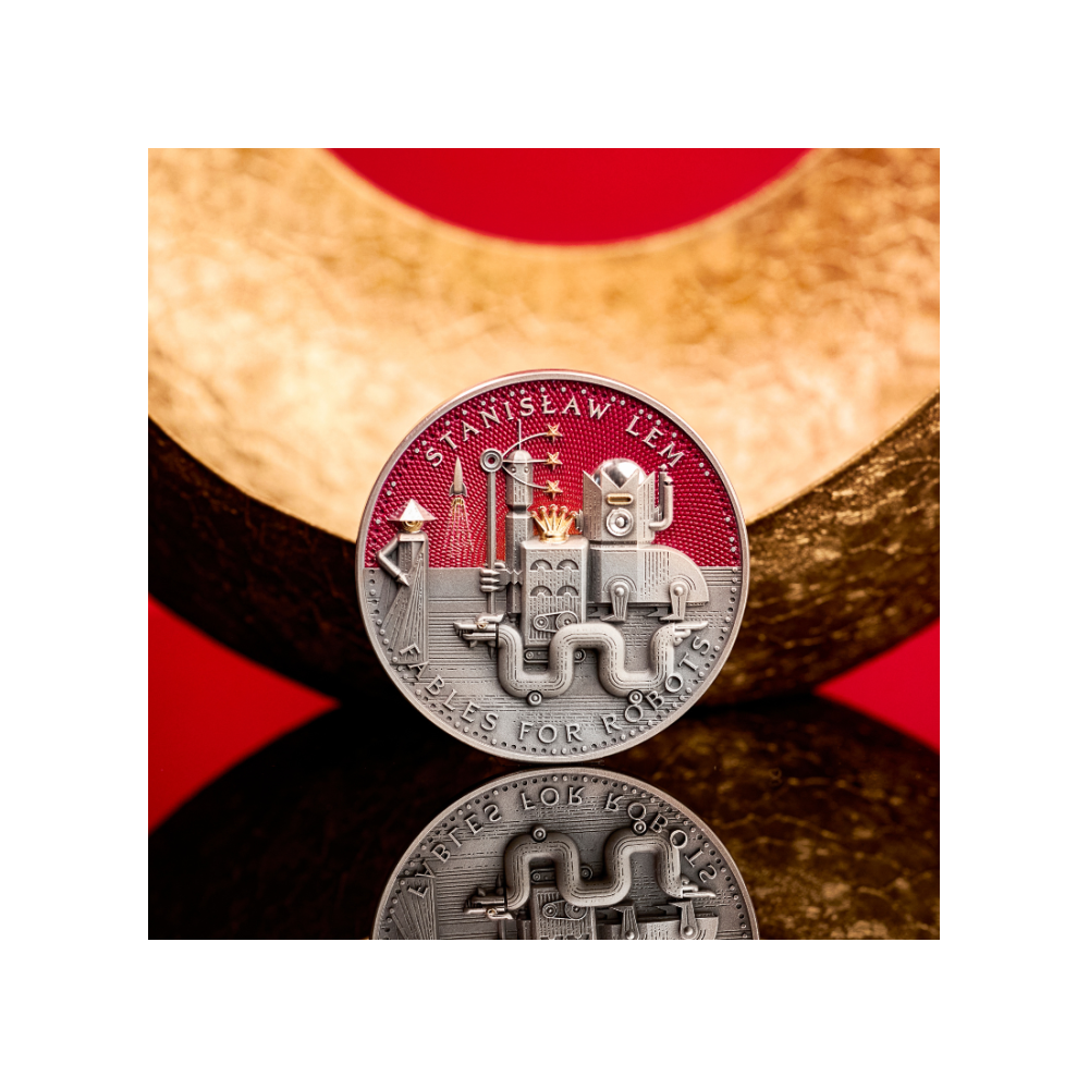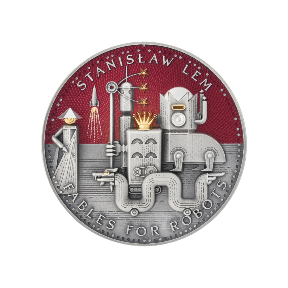 Die Rückseite der Münze zeigt eine faszinierende Szene, die von dem Roman Fabeln für Roboter, einem der bekanntesten Werke von Stanisław Lem, inspiriert ist. Das Motiv zeigt eine fantastische Roboterstadt mit monumentalen mechanischen Strukturen, Wachtürmen, stilisierten Händen und geheimnisvollen, alles sehenden Augen, die eine ebenso futuristische wie allegorische Atmosphäre schaffen. In der Mitte thront eine imposante Roboterfigur mit einer Krone, die über eine geometrische Stadtlandschaft blickt, während ein tiefroter Hintergrund die dramatische Wirkung noch verstärkt.