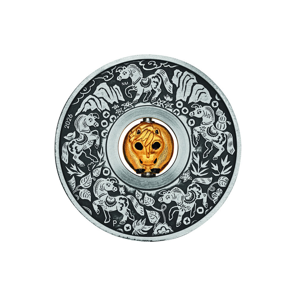 Auf der Rückseite der Münze ist eine rotierende vergoldete Silberperle in Form eines Pferdes abgebildet. Sie ist von fünf Pferden in verschiedenen Positionen umgeben, die im Stil des chinesischen Scherenschnitts dargestellt sind und von stilisiertem Laub umgeben sind. Das Münzzeichen der Perth Mint "P" und das Prägejahr 2026 sind ebenfalls enthalten.