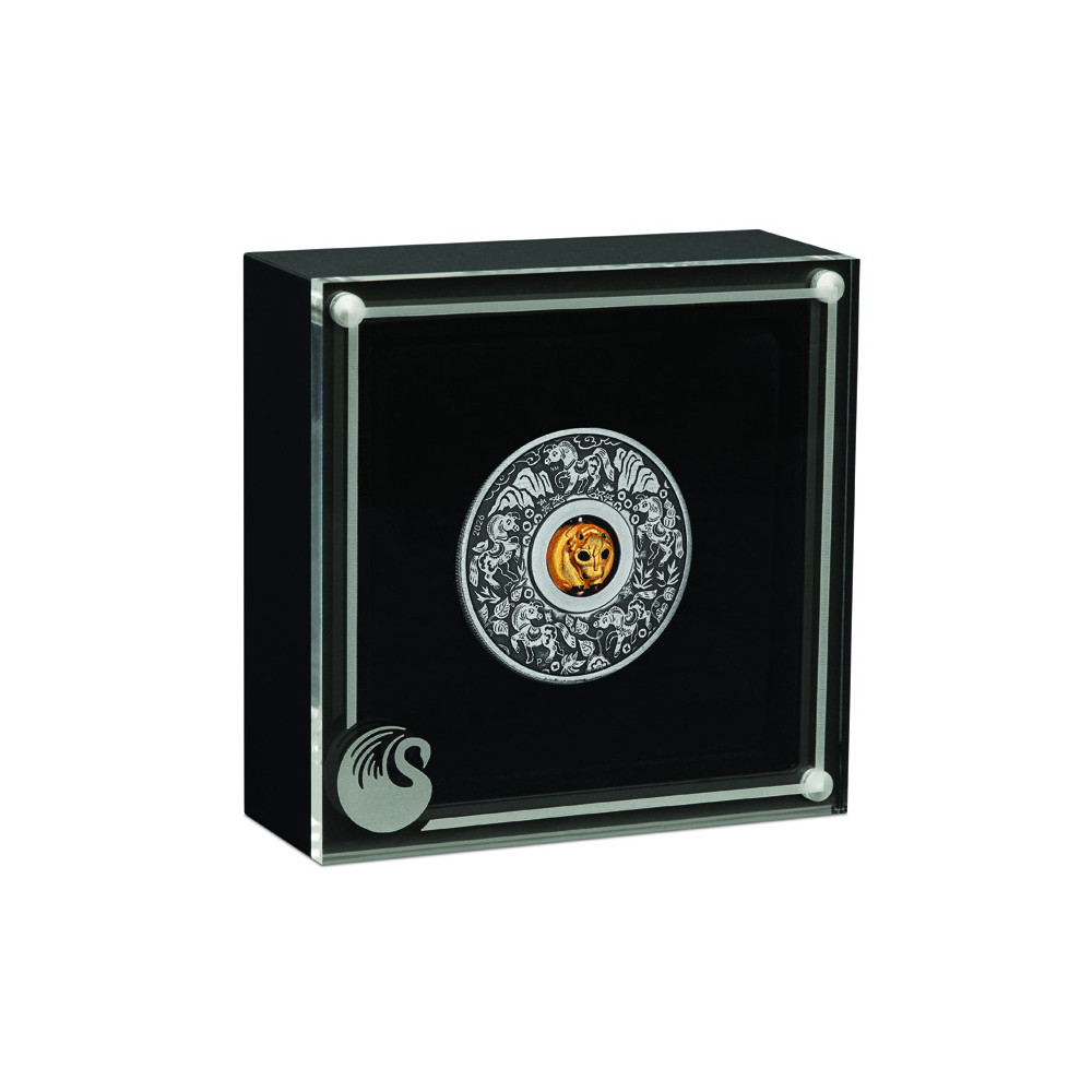 Die Münze wird mit einem nummerierten Echtheitszertifikat in einem klassischen schwarzen Schaukasten mit transparentem Deckel und stilvoller Verpackung geliefert.