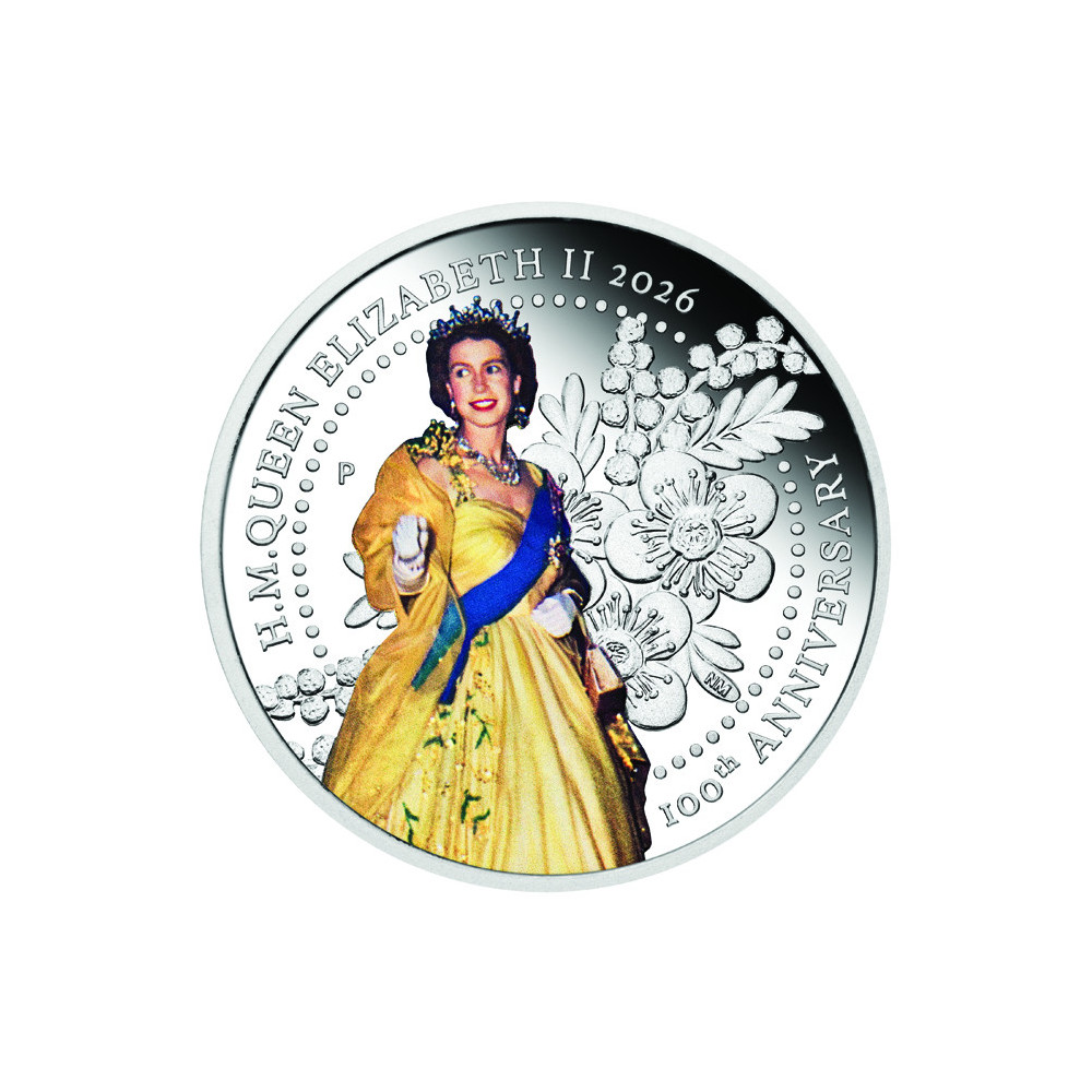 - Eine kolorierte Münze (Gesamtauflage 2.000 Stück), die Königin Elizabeth II. in ihrem berühmten Korbkleid von ihrer Australienreise 1954 zeigt, mit einer stilisierten Korbbrosche im Hintergrund.