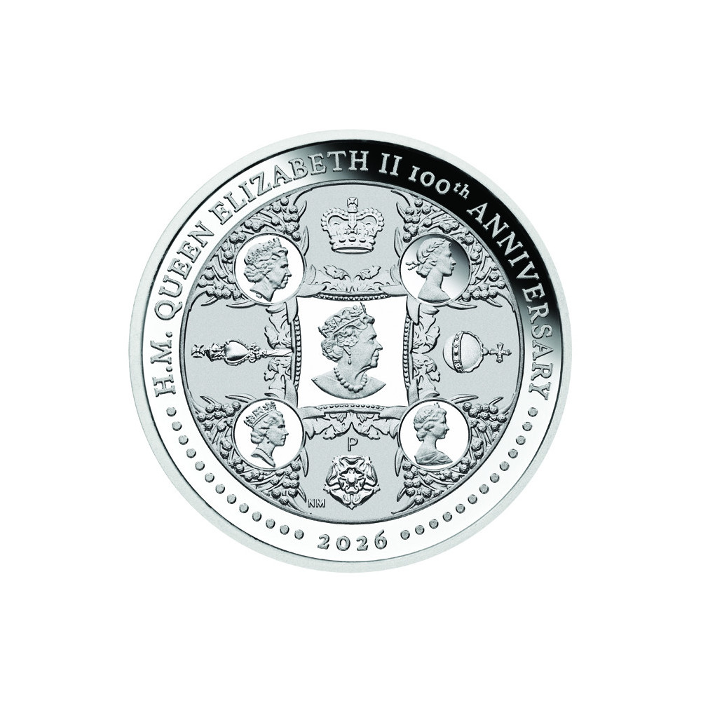 - Eine Silbermünze (Gesamtauflage 7.000 Stück) mit fünf Abbildungen von Königin Elizabeth II. aus verschiedenen Epochen ihrer Regierungszeit, umgeben von Goldgeflecht und königlichen Insignien.